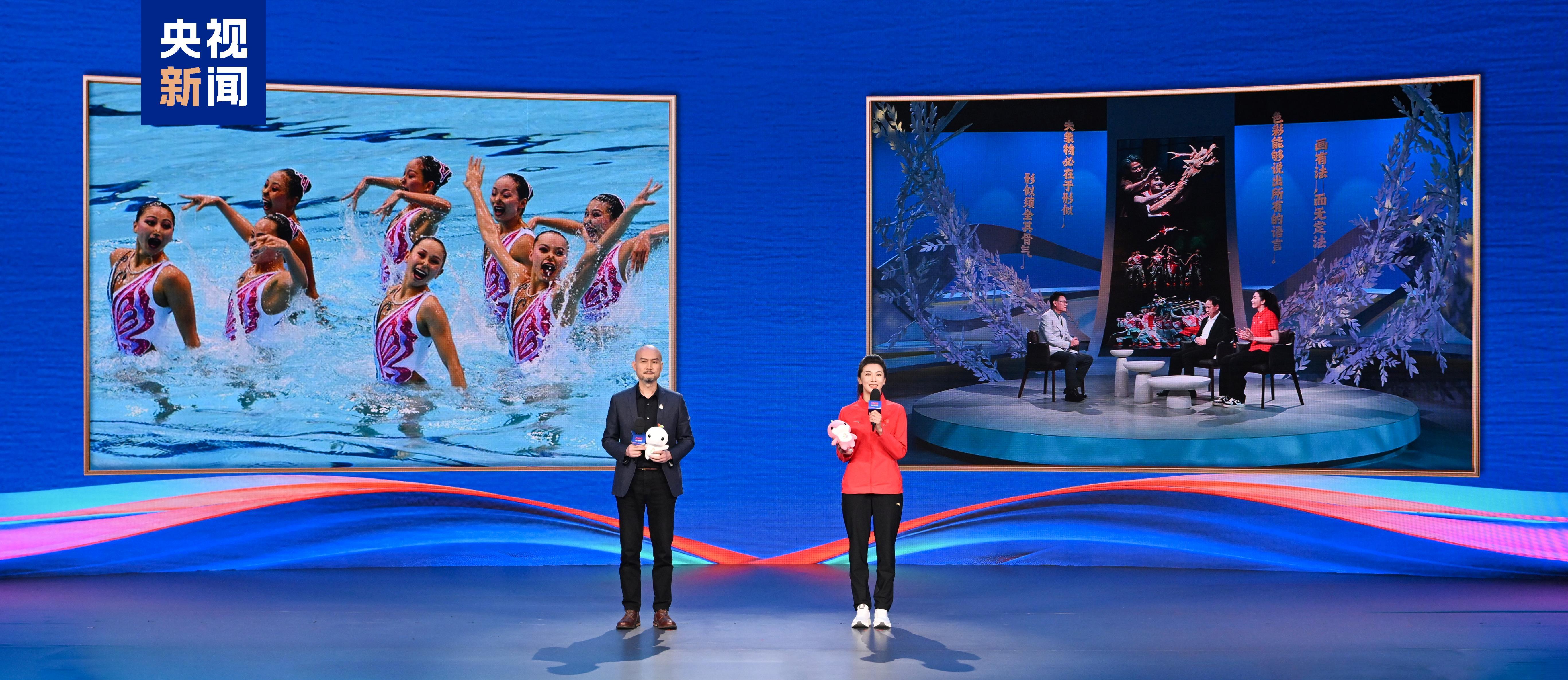 花样游泳世界冠军陈晓君(右)、第十五届全运会吉祥物设计者刘平云(左)推介全运会特别节目《艺术里的奥林匹克-粤动粤美》。