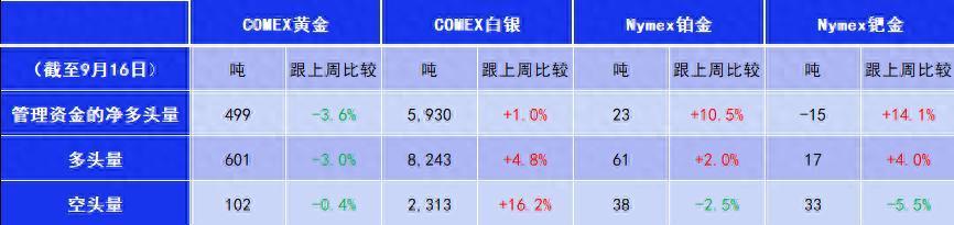 美期黄金基金多头上周环比跌3% ;基金空头同时跌0.4%,结果基金持仓在净多518吨水平回落至499吨,也是连续第102周基金净多的情况(再之前是连续46周净多),亦为2019年9月的历史最高位908吨的55%。今年至9月16日为止美元金价今年累积40.5% (上周+38.1%),基金多头同期内累积减少1.4% (上周+1.7%)。